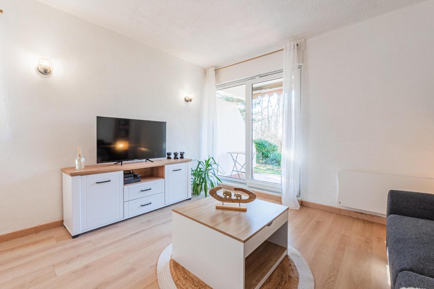 Disposant d’une terrasse et offrant une vue sur le jardin, cet appartement possède 1 chambre, un salon, une télévision à écran plat, une cuisine équipée avec un réfrigérateur et un four, ainsi que 1 salle de bains avec une douche. Des serviettes et du linge de lit sont à votre disposition.