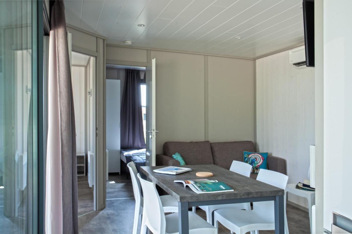 Chalet Prestige T3 proche de la mer (5 personnes). Ce chalet climatisé comprend une entrée privée, une cuisine, 2 chambres ainsi qu’une salle de bains avec douche et sèche-cheveux. La cuisine entièrement équipée est munie de plaques de cuisson, d’un réfrigérateur, d’un lave-vaisselle et d’ustensiles. Ce chalet bénéficie également d’un barbecue. Doté dune terrasse offrant une vue sur le jardin, cet hébergement dispose également dune machine à café et dune télévision à écran plat. Ce logement comporte 3 lits. ;