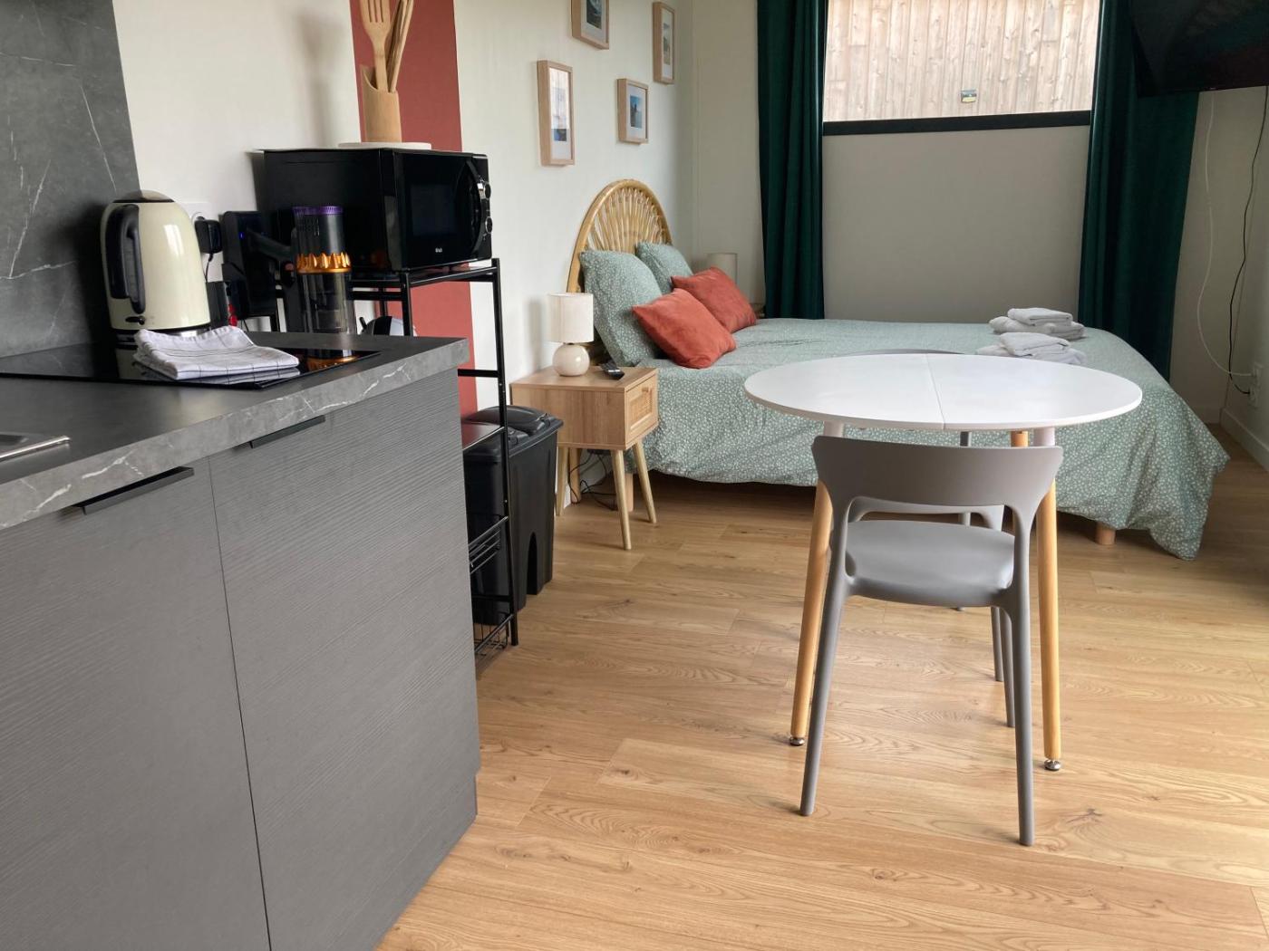 Appartement 1 Chambre. The air-conditioned apartment has 1 bedroom and 1 bathroom with a walk-in shower and a hairdryer. Guests will find a stovetop, a refrigerator, a microwave and a toaster in the well-fitted kitchenette. The apartment also comes with a barbecue. Boasting a terrace with garden views, this apartment also features a coffee machine and a flat-screen TV with streaming services. The unit has 1 bed.