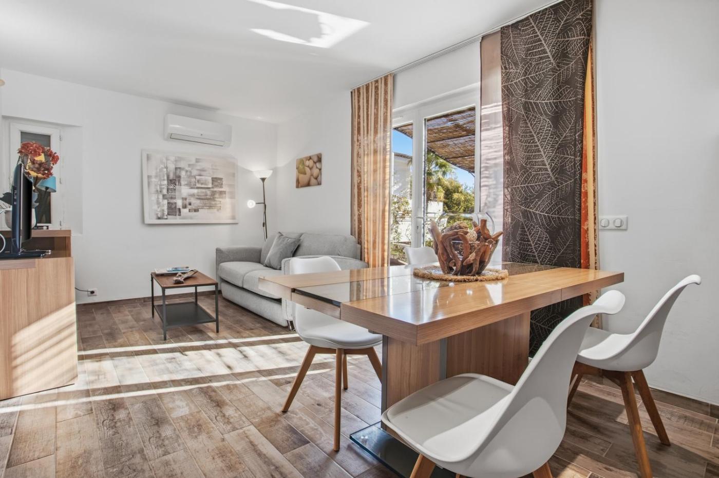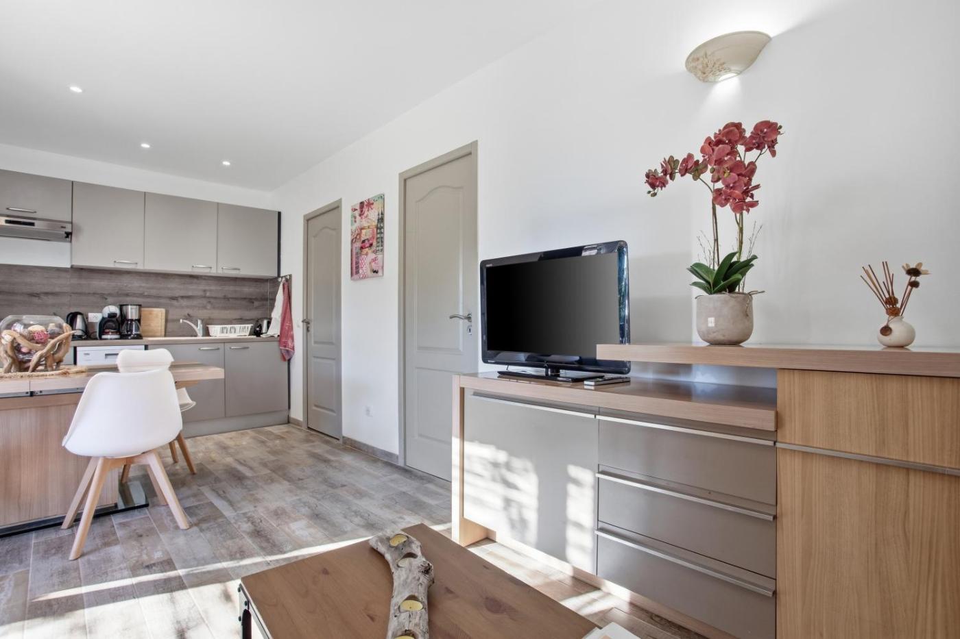 Appartement 1 Chambre - Vue sur Jardin. Featuring a private entrance, this air-conditioned apartment is comprised of 1 living room, 1 separate bedroom and 1 bathroom with a shower and a hairdryer. The well-equipped kitchen features a dishwasher, kitchenware, a microwave and a toaster. Boasting a terrace with garden views, this apartment also offers a washing machine and a TV. The unit offers 2 beds.